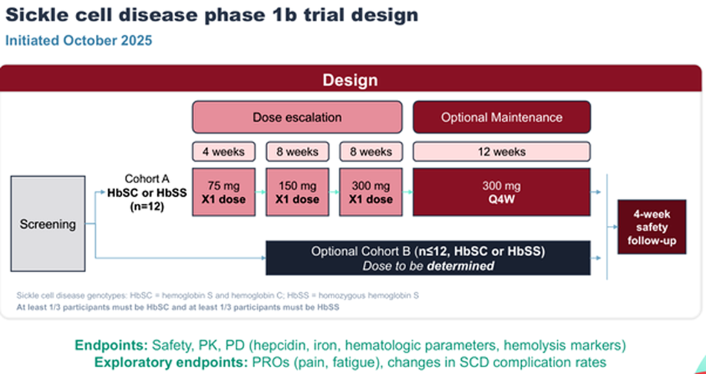 - Preliminary findings in healthy volunteers in both single ascending dose (SAD) and multiple ascending dose (MAD) groups showed meaningful and sustained serum iron reductions, a safe and tolerable profile, and no serious adverse events.